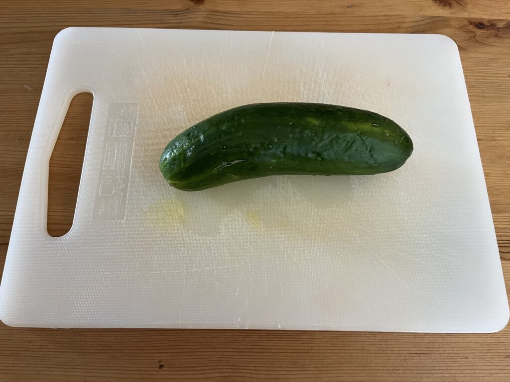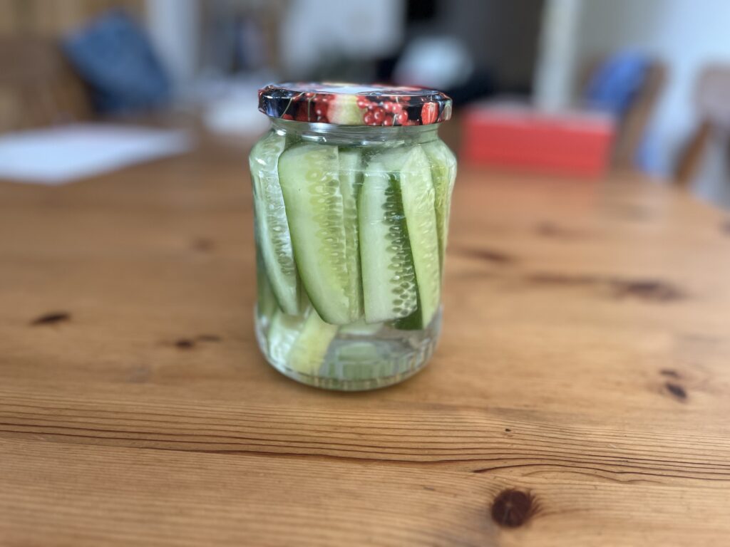 Dazu werden die Gurken in Streifen geschnitten, in ein Einmachglas einsortiert und mit Salzlake bedeckt. Die Salzlake muss einen Salzgehalt von 2% des Gesamtgewichts beinhalten. Dazu wird das leere Gurkenglas auf eine Waage gestellt und diese per Tare auf 0 gesetzt. Nach dem Einschlichten der Gurken wird Wasser aufgegosse, bis die Gurken vollständig bedeckt sind. 2% des Gesamtgewichts werden danach in Form von Salz in eine Schlüssel gegeben. Das Wasser aus dem Einmachglas wird ebenfalls dazu geleert und so lange umgerührt, bis sich das Salz vollständig aufgelöst hat. Diese Salzlake wird anschließend wieder in das Einmachglas geleert und dieses leicht verschlossen. Und jetzt heißt es wieder warten!